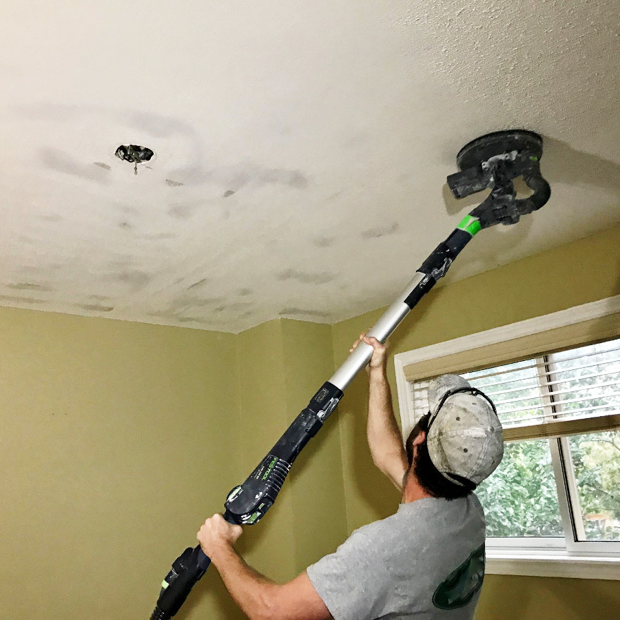 We remove your popcorn ceiling using the Festool Dust Extractor which is a German engineered 2 in 1 drywall sander with a built in high power vacuum for maximum dust extraction. The end result is your popcorn ceiling is removed efficiently with almost no dust.