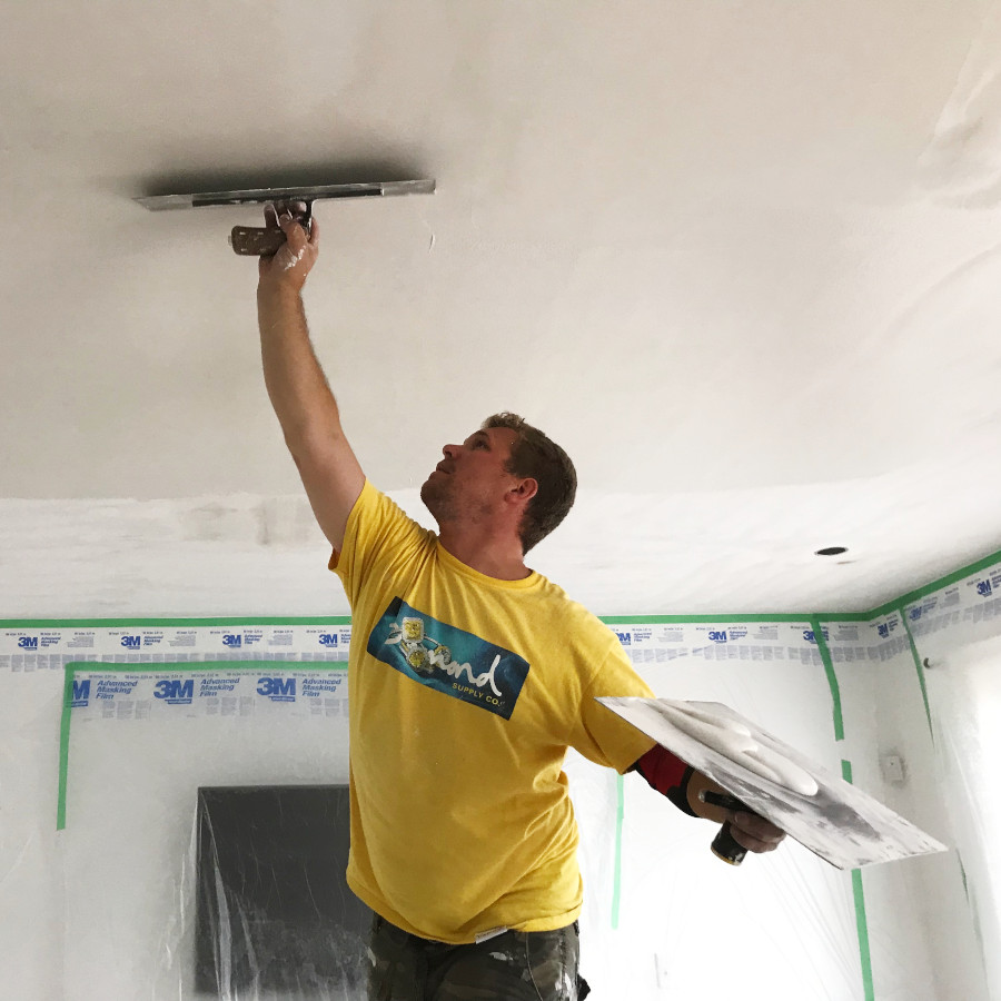 We will skim coat a minimum 2 layers of plaster on your entire ceiling. We allow the plaster 24 hours to dry before applying the second coat and sand in between each coat.
